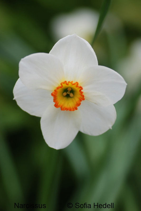 Narcissus poeticus, poetpingstlilja, men vilken sort? I närheten växte 'Recurvus' och 'Actaea', men denna är annorlunda. Ringen på kronan är orange, men bleknar snabbt. Den är definitivt inte röd. Men 'Actaea' finns både med rött och med orange? Den är nog ganska gammal. Från en skräphög där den vuxit i decennier. Förmodligen slängd där från någon av trädgårdarna i närheten. Blommar samtidigt med 'Recurvus', så senblommande och ungefär samma höjd. Kronbladen glittrar som attan på denna okända sort.